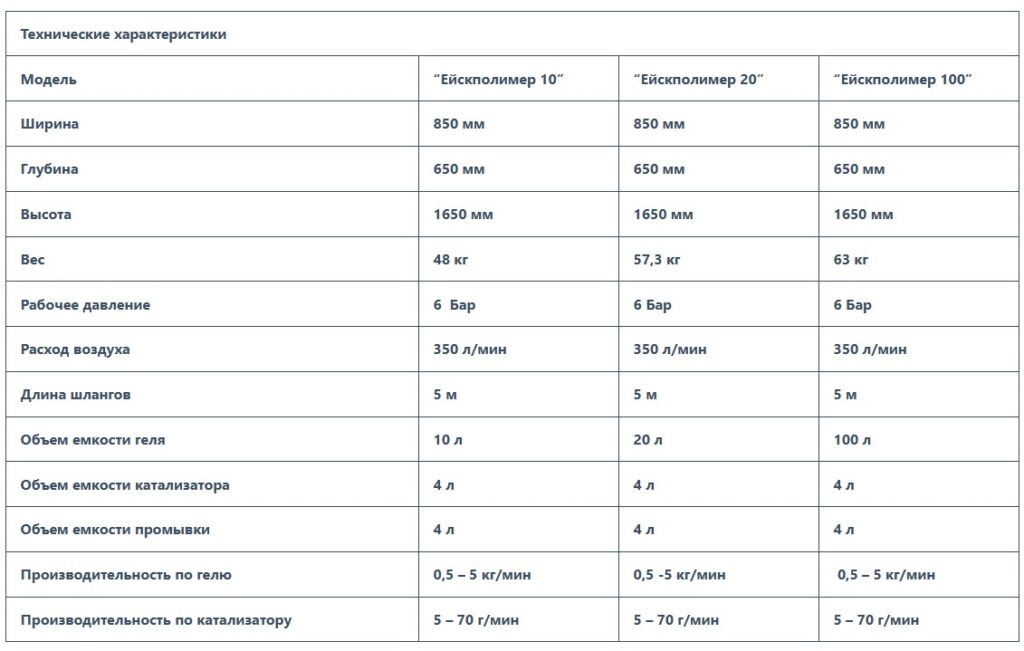 Модель “Ейскполимер 10”. Комплектуется 10-и литровой емкостью; Модель “Ейскполимер 20” комплектуется двумя емкостями по 10 литров каждая; Модель “Ейскполимер 100” комплектуется передвижной емкостью на 100 литров с системой быстроразъемных соединений для подключения к установке.