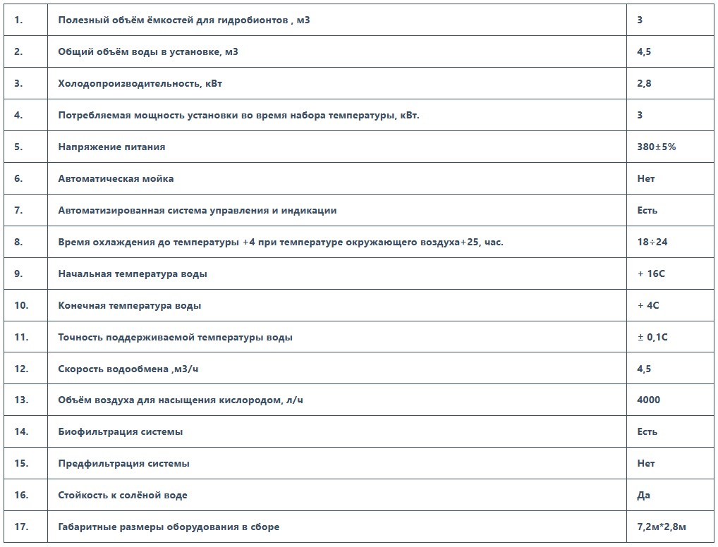 Установка рассчитана для заполнения солёной водой с возможностью её охлаждения и поддержания температуры в диапазоне от+10С˚ до+4С˚ (±0,1С°).