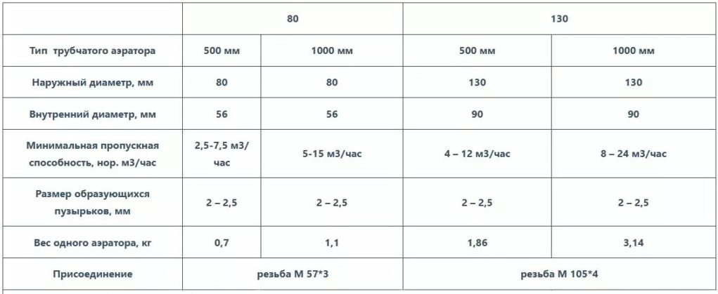 Технические характеристики трубчатого аэратора: