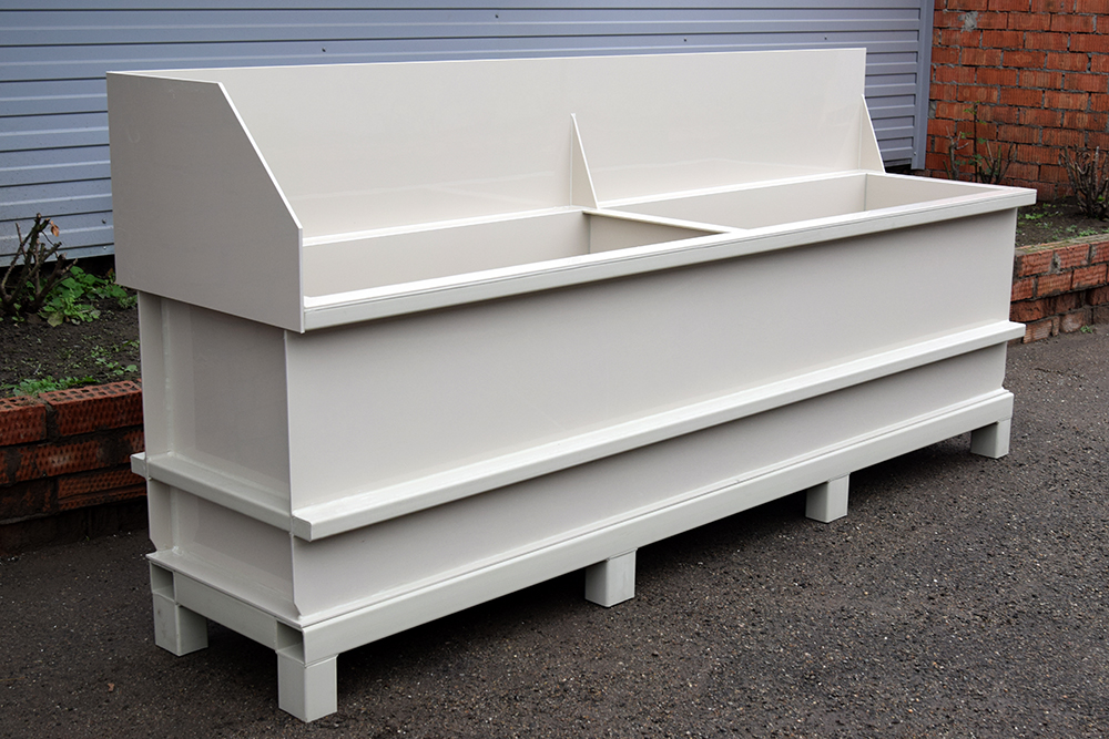 Оснащена: четырьмя съемными решетками, столешницей, сифоном.