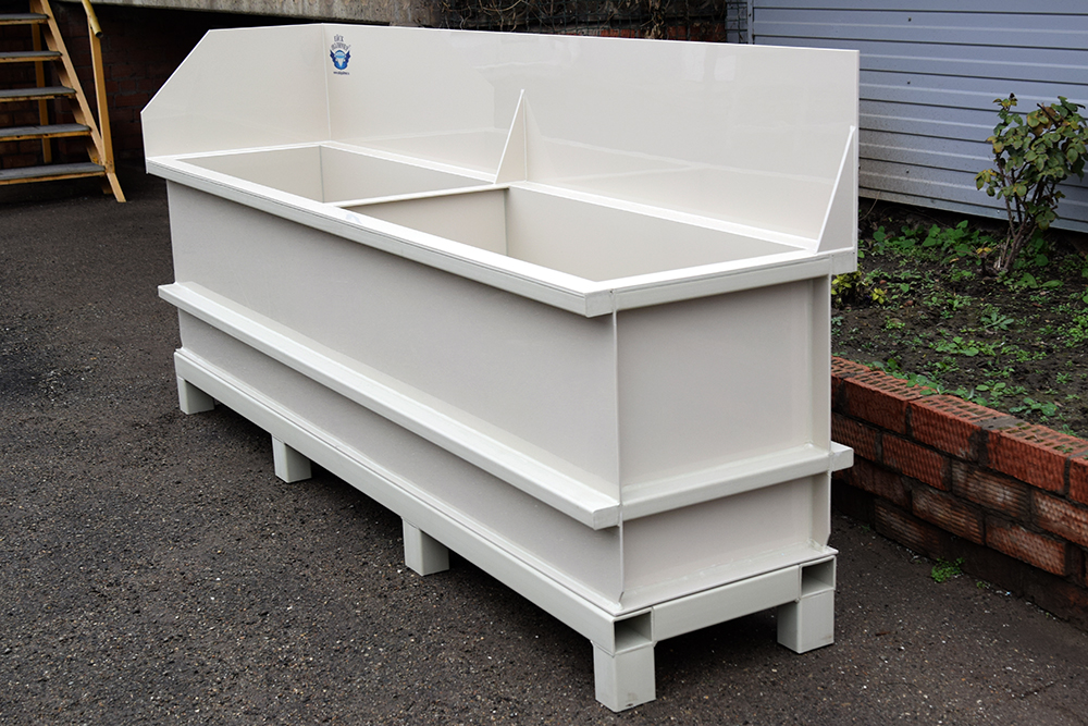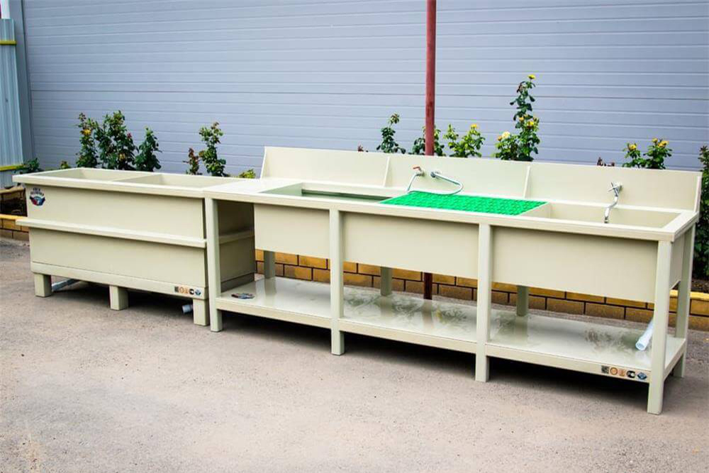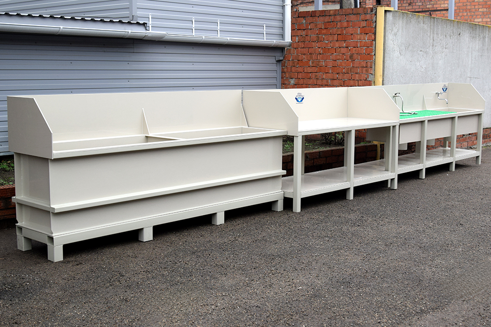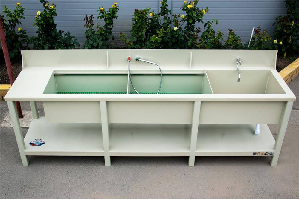 В дно каждой мойки встроена съемная корзина для сбора крупных загрязнений (чешуя, потроха, субпродукты и др.), которая при заполнении вынимается и очищается.