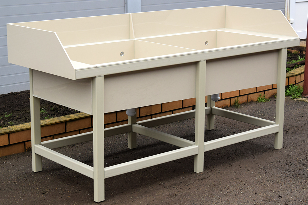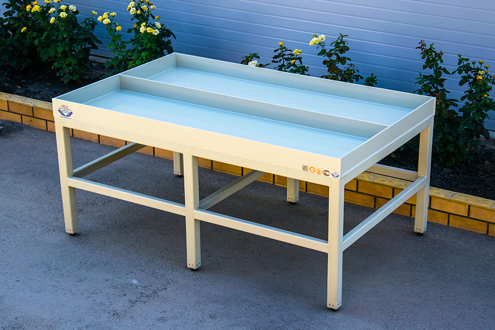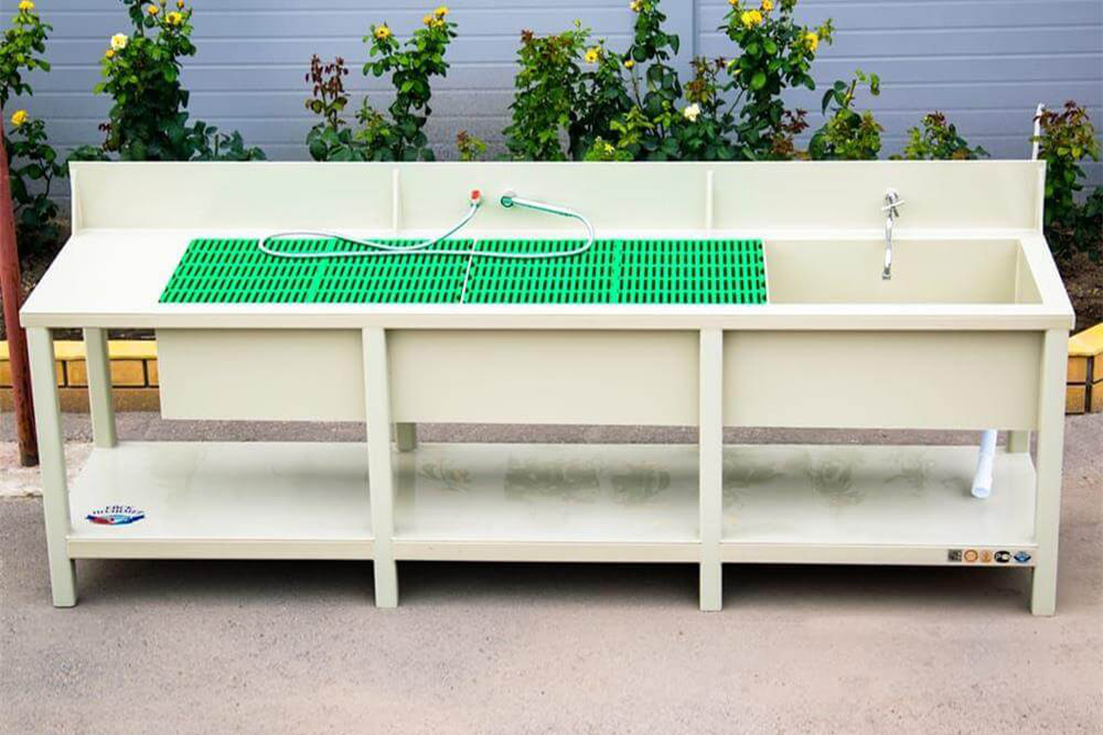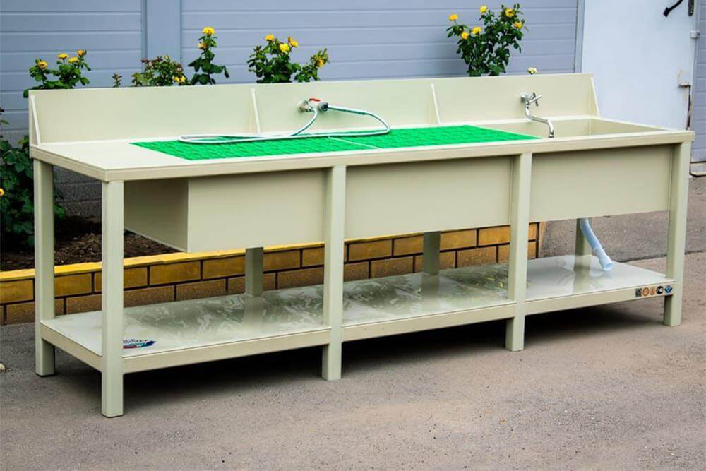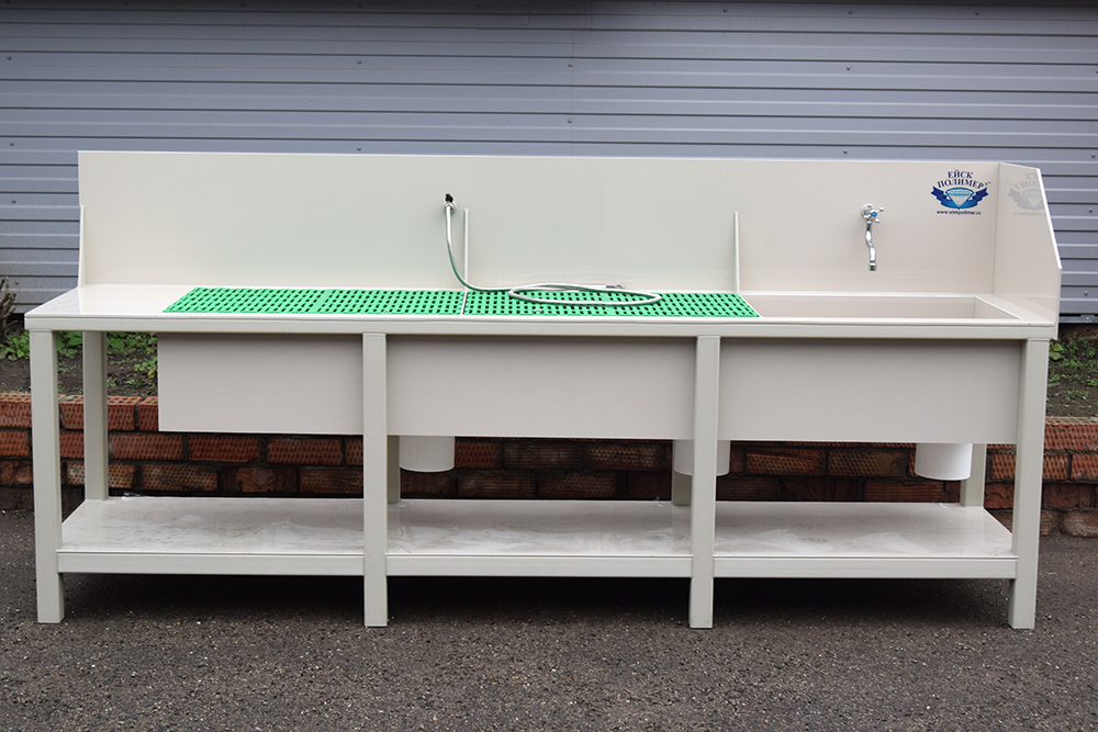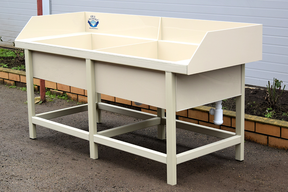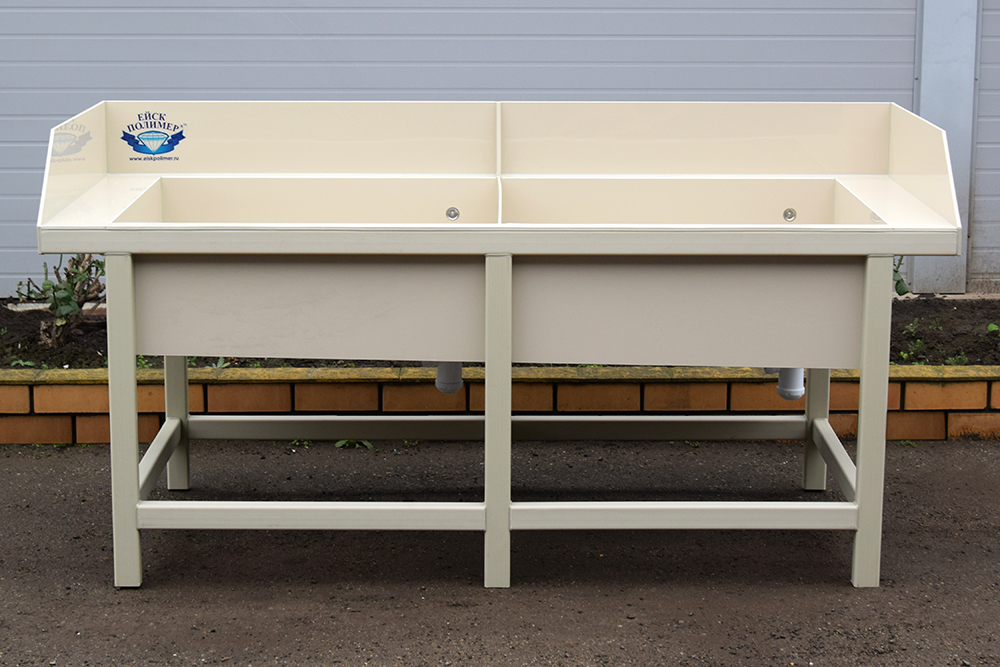 Конструкция включает стол и две мойки, что обеспечивает возможность одновременного выполнения нескольких задач.