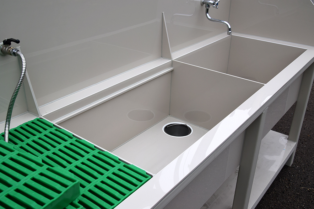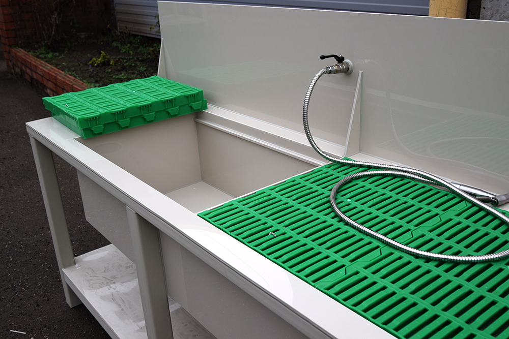 На мойке предусмотрен уклон для полного слива воды, сифон. По согласованию с заказчиком дополнительно возможна комплектация смесителем, кранами, съемной корзиной для сбора крупных загрязнений.