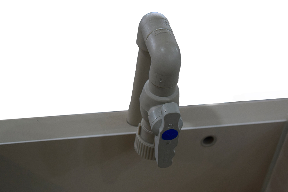 Бак оснащен 4 кранами (один кран установлен на двух верхних патрубках, в секциях: ополаскивание и промывка, подключается к системе централизованной подачи воды;