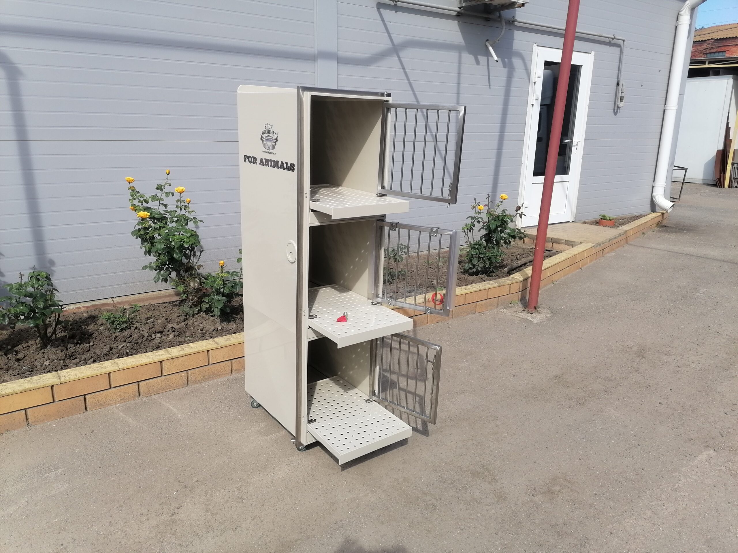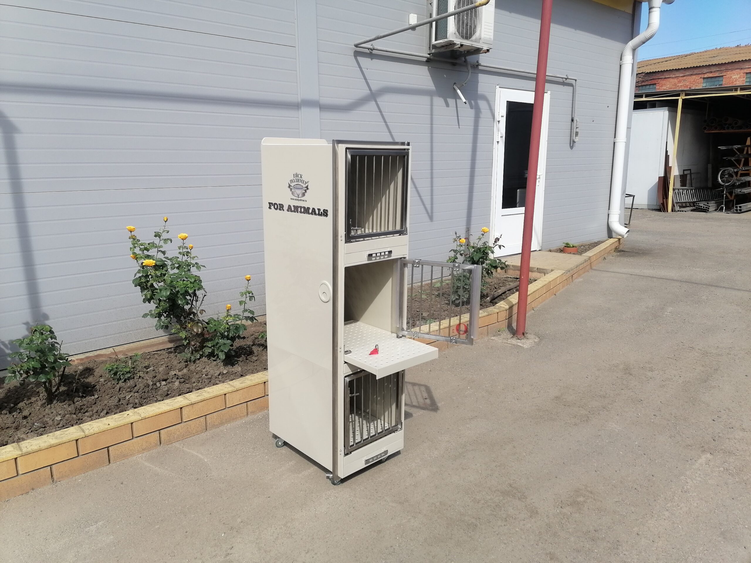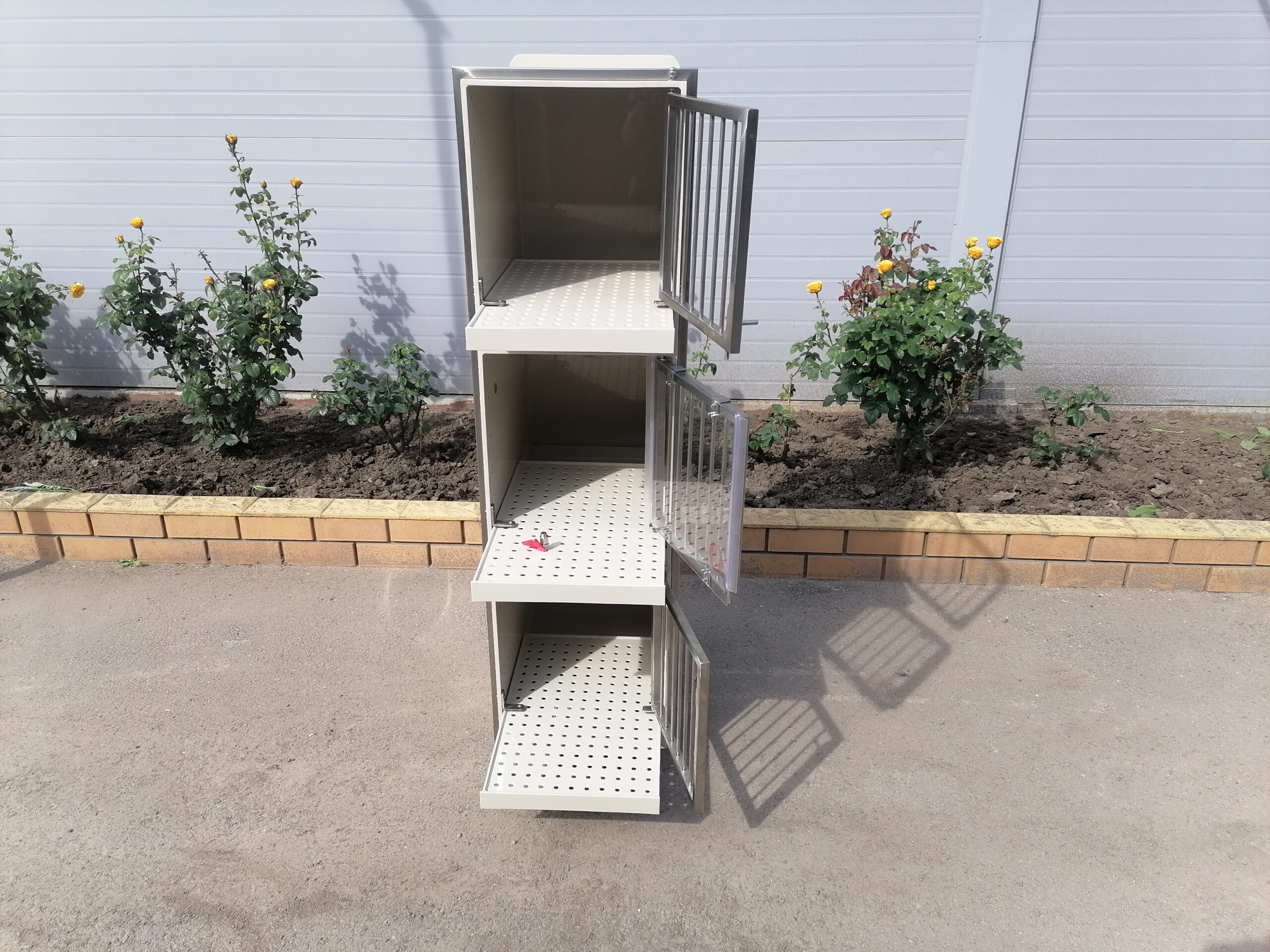 Клетка для животных, выполнена из прочного, химически стойкого, пищевого пластика – полипропилена (PP). Корпус клетки утеплен. Дверцы секций, включая крепеж, выполнены из нержавеющей стали AISI 304. На дверцах клетки имеются накладки из поликарбоната для утепления.
