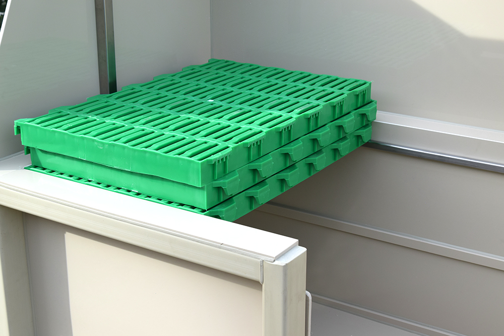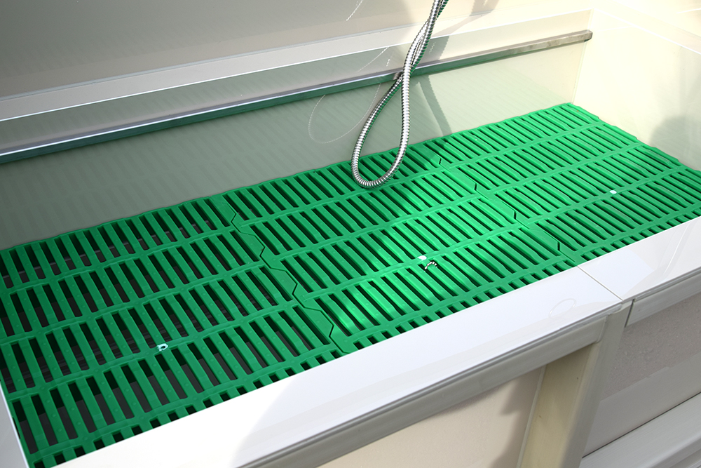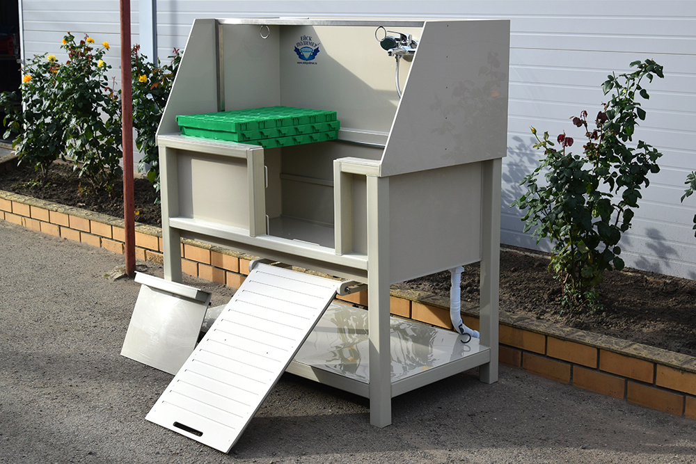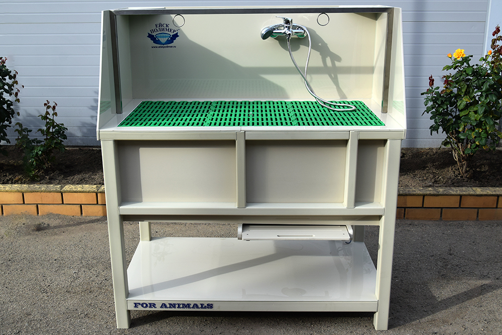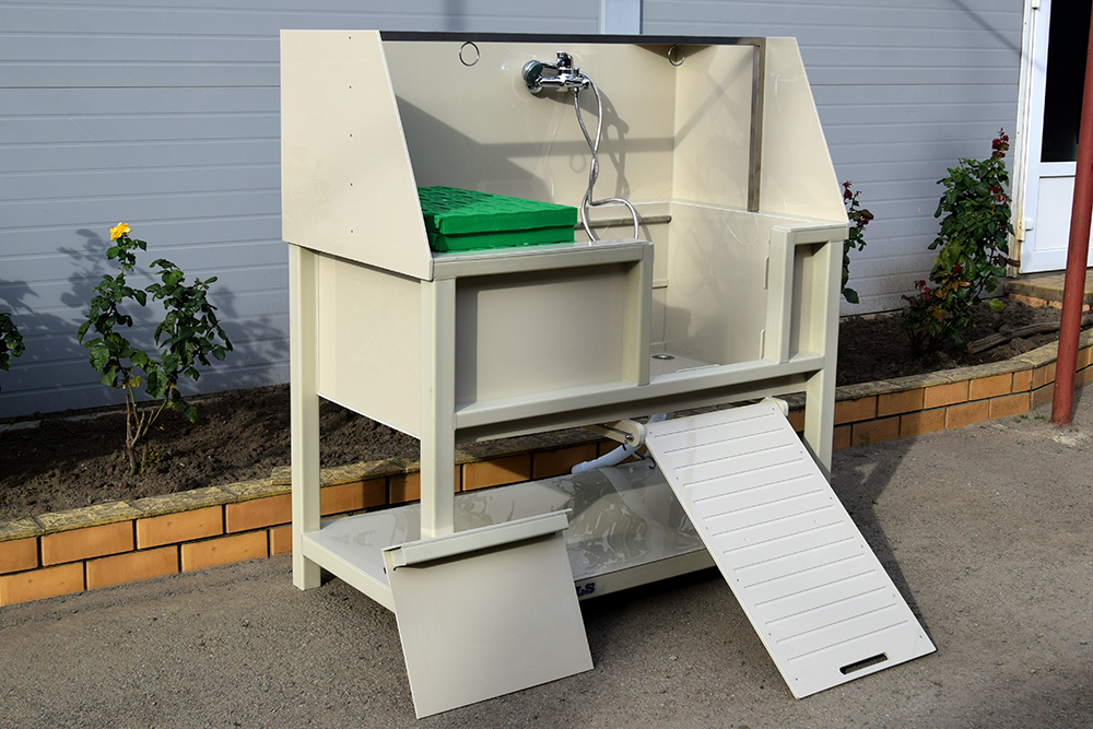 Мойка выполнена из полипропилена, с использованием нержавеющей стали. Оснащена тремя съемными пластиковыми решетками, смесителем для душа, сифоном, дверкой и трапом для животных. Трап для животных выполнен с правой стороны.