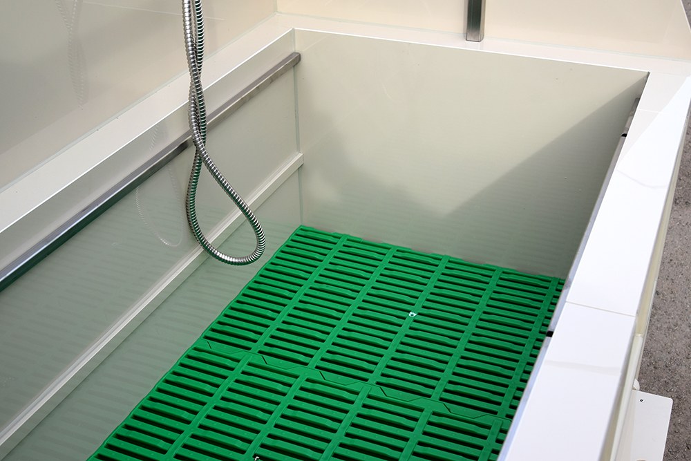 Мойка выполнена из полипропилена, с использованием нержавеющей стали. Оснащена четырьмя съемными пластиковыми решетками, смесителем для душа, сифоном, дверкой и трапом для животных. Трап для животных выполнен с левой стороны.